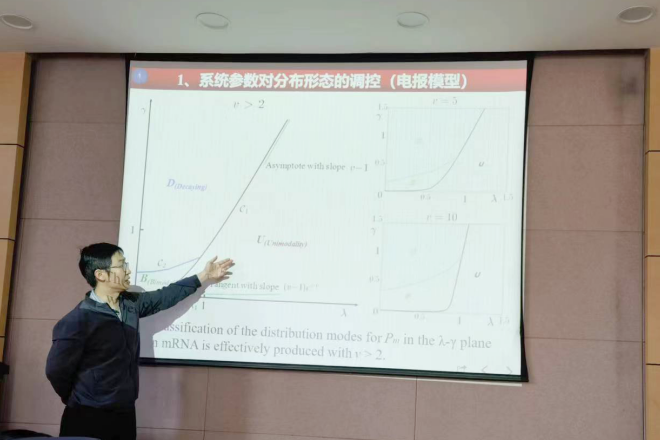 焦锋教授的报告题目为“What can we learn when fitting a complex gene expression model to a simple telegraph model?”。电报模型,又称两态模型,是应用最广泛的基因表达模型,大量现代生物学结论都是基于此模型的。然而,电报模型的滥用不利于生物学的健康发展。焦锋教授及其合作团队研究了电报模型在复杂场景下应用的可靠性,取得了有益进展。本次报告中,焦锋教授详细介绍了他们的研究成果。