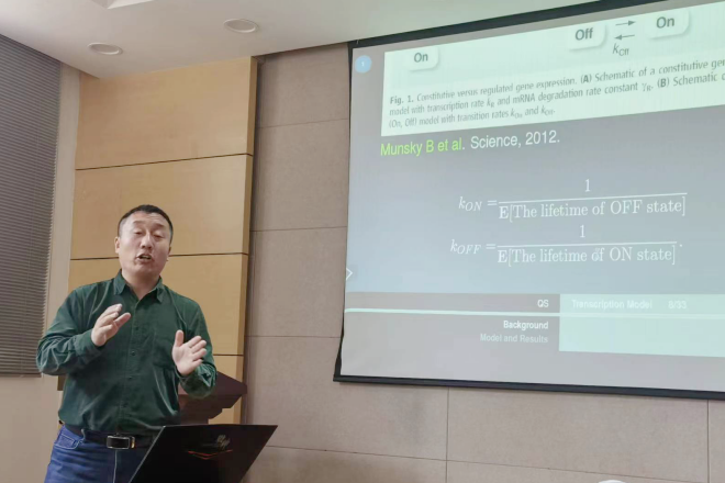 孙启文副教授的报告题目为“A computational model for analyzing stochasticity in gene transcription”. 无论基因的ON态,还是OFF态,都不是严格意义上的单一状态,而是多个寿命服从指数分布的状态的持续存在。客观上有几个状态是现有技术难以分辨的,但这对于转录动力学的研究是基础性课题。孙启文副教授报告了他们的研究策略和富有启发性的研究成果。
