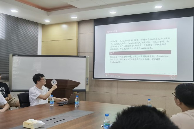 万小磊博士首先介绍了定义在非阿基米德局部域上的spherical簇的Plancherel分解的一般情形,这是相对朗兰兹纲领领域中的一个重要课题。作为工具,万博士还介绍了Weil表示以及局部theta对应的相关理论。最后,万博士讲解了对于X=SO(1,4)/U(2)时其上的具体的Plancherel分解。报告期间,师生与万博士进行了深入交流,万小磊博士耐心回答了同学们的问题。同学们纷纷表示,报告十分精彩,令人受益匪浅。