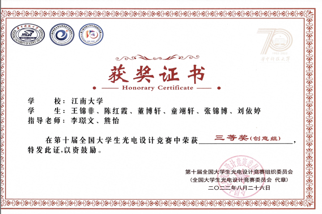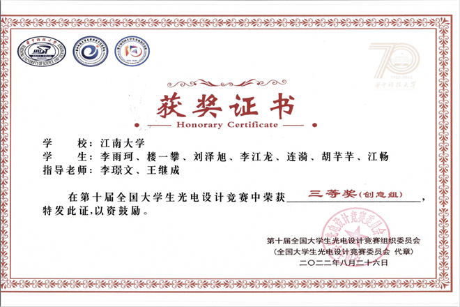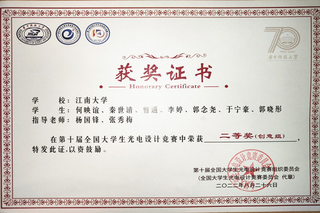 赛事由中国光学学会主办、全国老员工光电设计竞赛委员会(以下称“全国光电竞赛委”)具体负责、华中科技大学承办,于2022年8月24日-26日在华中科技大学以线上创新赛的形式开展。决赛分为创意组与初创组,创意组最终由182支队伍入围全国决赛路演现场答辩。经过师生共同努力和精彩演讲答辩,杨国锋,张秀梅老师指导,秦世清等同学完成的《基于第三代半导体SIC-MOSFET的离网型光伏逆变系统》荣获二等奖;李璟文,熊怡老师指导,王锦非等同学完成的《基于无人机遥感影像智能城镇垃圾监管系统》;李璟文,王继成老师指导,李雨珂等同学完成的《果蔬无损检测及智能分拣》荣获三等奖。