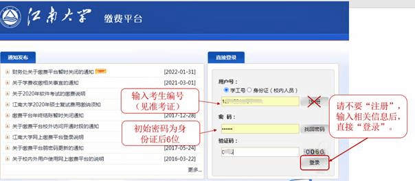 支付复试费80元(仅申请考核考生,硕博连读考生无须缴费),请不要注册,直接输入用户名及密码直接登录!登录用户名为准考证上的考生编号(请考生下载准考证查看,准考证打印系统网址:http://yzgmis.jiangnan.edu.cn/zsgl/bswb/login.aspx),初始密码为身份证号码后6位。