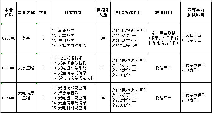 光学工程专业学位硕士点2010年获批,2021年更名为光电信息工程,设有光谱技术及应用、成像与显示、光电器件及应用、光通信与光信息、光电材料及应用五个方向。