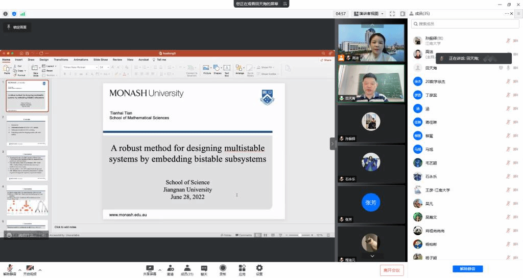 6月28日下午,澳大利亚莫纳什大学数学公司田天海教授应邀在线作了题为“A robust method for designing multistable systems by embeddingbistable subsystems”的学术报告。报告会由williamhill英国官网副经理高洁教授主持,williamhill英国官网的部分教师与员工聆听了该报告。