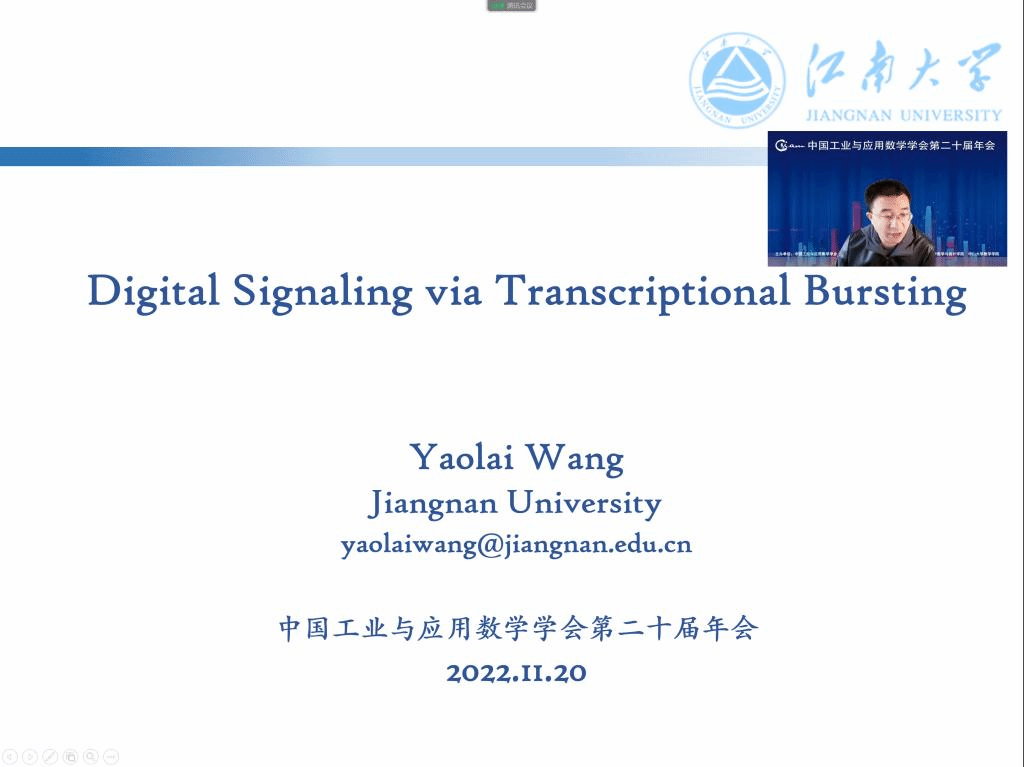 11月20日上午,公司数学学科硕士生导师王耀来副教授应邀在“数学与生命科学的交叉”主题讨论会上做了题为“Digital signaling via transcriptional bursting”的报告。这也是公司数学学科教师继去年首次在中国数学会学术年会上亮相以来,又首次在中国工业与应用数学学会学术年会上亮相,进一步扩大了公司数学学科在全国的影响力。