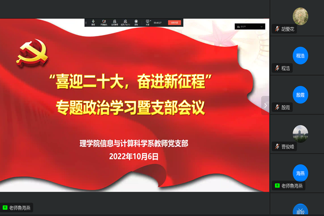 10月12日下午,信计系教师党支部以线上会议的形式开展了“喜迎党的二十大,奋进新征程”专题政治学习暨支部会议,会议由支部书记鲁海燕主持。