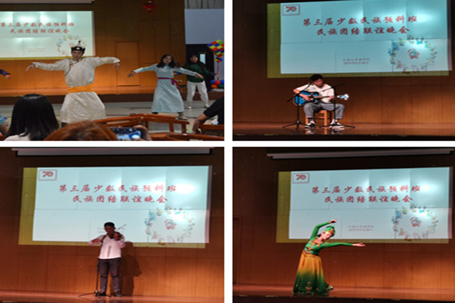 随后,晚会在一片热烈的掌声中正式拉开序幕。由老预科生带来的一曲《民族歌曲串烧》点燃了整个会场的气氛;各个民族的特色节目将民族服饰、生活习俗与艺术表演结合在一起,充分展示了各民族的特色风情和文化魅力;一首《我和我的祖国》更是表达了预科生对祖国的爱恋之情。整个晚会民族特色浓郁,感情真挚浓厚,促进了各民族同学之间的相互了解、相互交融。最后,在一段段歌舞的陪伴中,晚会逐渐接近尾声,在持续高涨的热烈气氛中落下了帷幕。