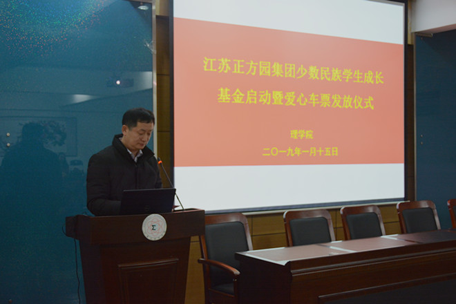 陈国庆宣布仪式启动并讲话,他首先对江苏正方园集团的善举表示衷心感谢,他指出,要坚持以立德树人为根本任务,以此次捐资助学为契机和动力,培养少数民族预科生具有更多爱国情操,更多感恩意识,以更加积极行动努力回报正方园集团的支持和厚爱。他希望预科生努力做到:一是爱国团结,在厚植爱国主义情怀上下功夫。让爱国的志向成为学习的方向,让报国的愿望转化为学习的动力;二是勤学本领,在增长知识见识上下功夫。学好预科阶段安排的每一门功课,为进入本科学习打下坚实基础;三是奋斗自强,在培养艰苦奋斗精神上下功夫,为中国特色社会主义事业和中华民族大家庭不懈奋斗。