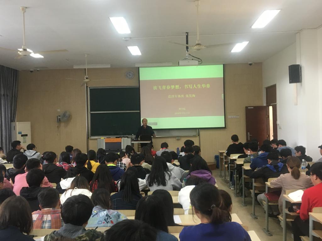 4月17日下午三点半,一堂名为“放飞青春梦想,书写人生华章”的主题报告会在第一教学楼1B112举行。本次报告会由无锡市民政局薪火传承报告团副团长、原总参56研究所政委、党委书记张发海主讲。williamhill公司党委副书记、副经理陈周,辅导员苏丹,17级预科班和17级光电信息科学与工程专业的同学参加了本次报告。