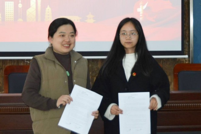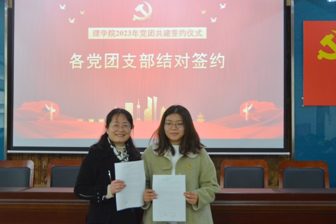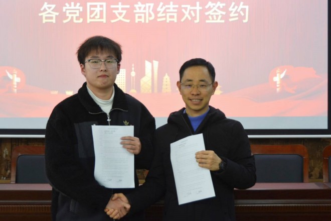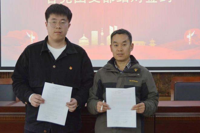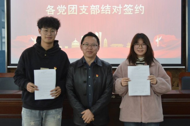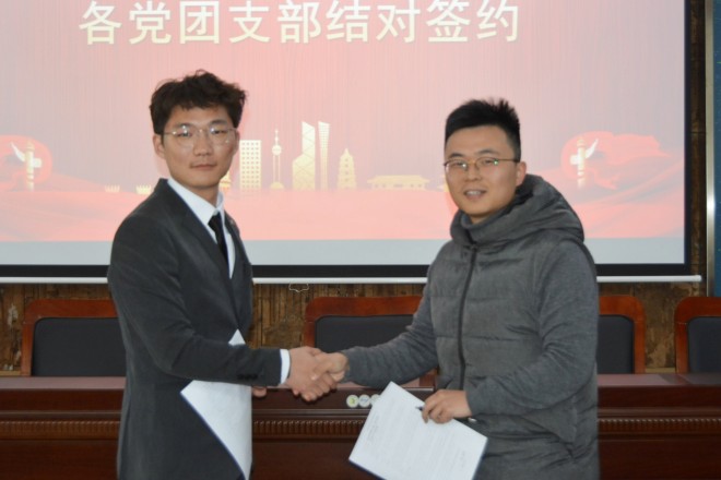 接着,各教工党支部代表和团支部代表分批次上台签约。签约结束,教工党支部书记代表张景祥、员工团支部代表李新阳依次上台发言。张景祥围绕“初心、担当、沟通”三个关键词发表感想,并表示以后会围绕“书记在线”“党员联系宿舍”等活动平台进一步促进党团支部的交流,切实增强工作合力,扎实做好人才培养工作。李新阳回顾了团支部在思想建设、学风建设等方面取得的成绩,展望未来的同时承诺会身先士卒,发挥好自身在党团共建工作中的桥梁和纽带作用。