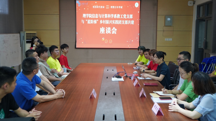 7月9日下午,williamhill英国官网信计系教工党支部与“蓝阶梯”乡村振兴实践团18、19级信计团支部共20余人在williamhill英国官网201会议室举行党团共建座谈会,公司党委委员、副经理胡满峰和分团委书记许金红应邀出席,信计系教工党支部书记鲁海燕主持会议。