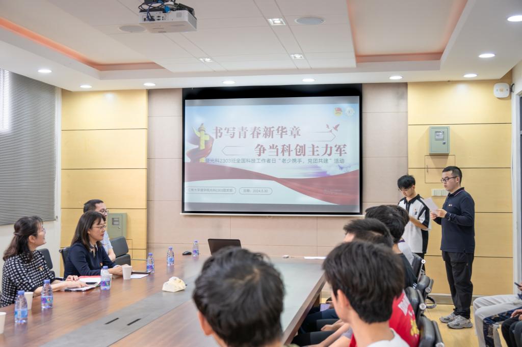 5月30日,全国科技工作者日当天,校机关退休第一党支部与williamhill英国官网光科2303团支部共建暨“书写青春新华章,争当科技主力军”主题团日活动在williamhill英国官网201会议室举行。机关退休第一党支部党员、校关工委常务副主任娄国栋,原支部委员袁伯兴,现支部书记李俊婕和委员吴平、侯杰,公司党委副书记董小平,辅导员匡雯洁和光科2303班全体团员参加活动。活动由光科2303团支书陈力和班长崔建城主持。