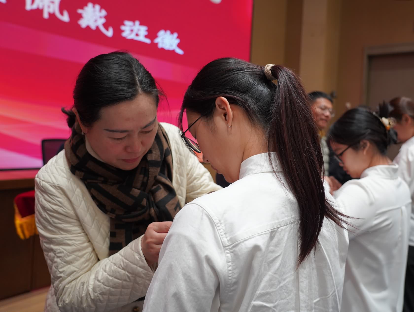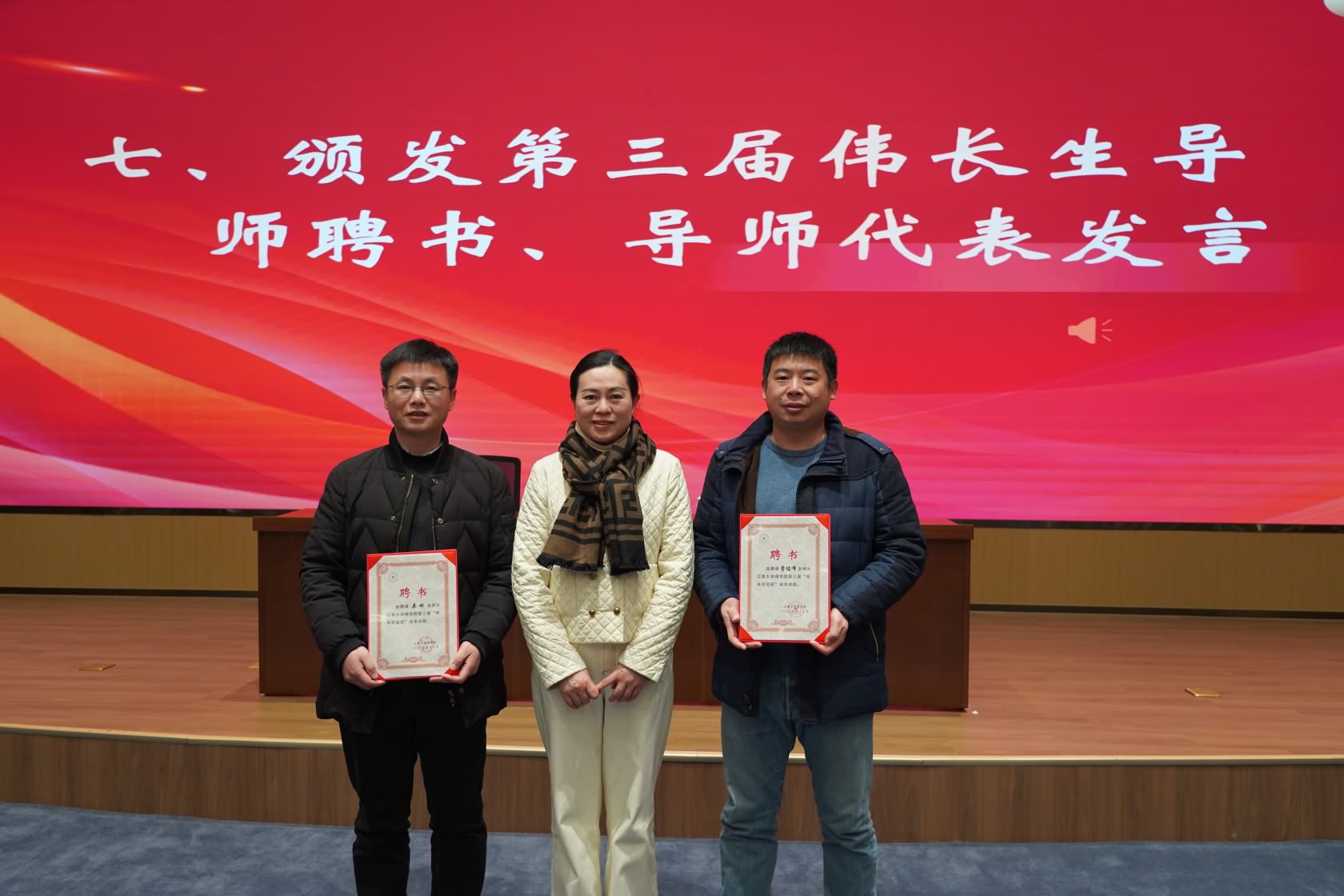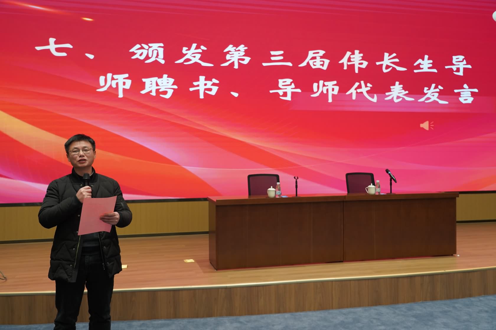 许群向第三届伟长班员工代表授旗。刘朗宣读伟长班导师聘任名单,许群向导师代表曹俊峰、桑田颁发聘书。桑田作为导师代表发言,祝愿同学们珍惜青春年华,敢于担当,勇于追求,以梦为马,笃定前行,不负祖国和人民的重托和大好青春年华。随后,陶文沂、公司领导和伟长班导师代表共同为每一位伟长生佩戴班徽。第三届伟长生代表陈子杨发言,他表示自己将以严谨的态度、敏锐的洞察和坚韧的毅力面对将来的学习,以科学精神为指引,以创新能力为驱动,努力成为具有国际视野、家国情怀的卓越人才。最后,伟长班全体同学集体宣读了志愿词。