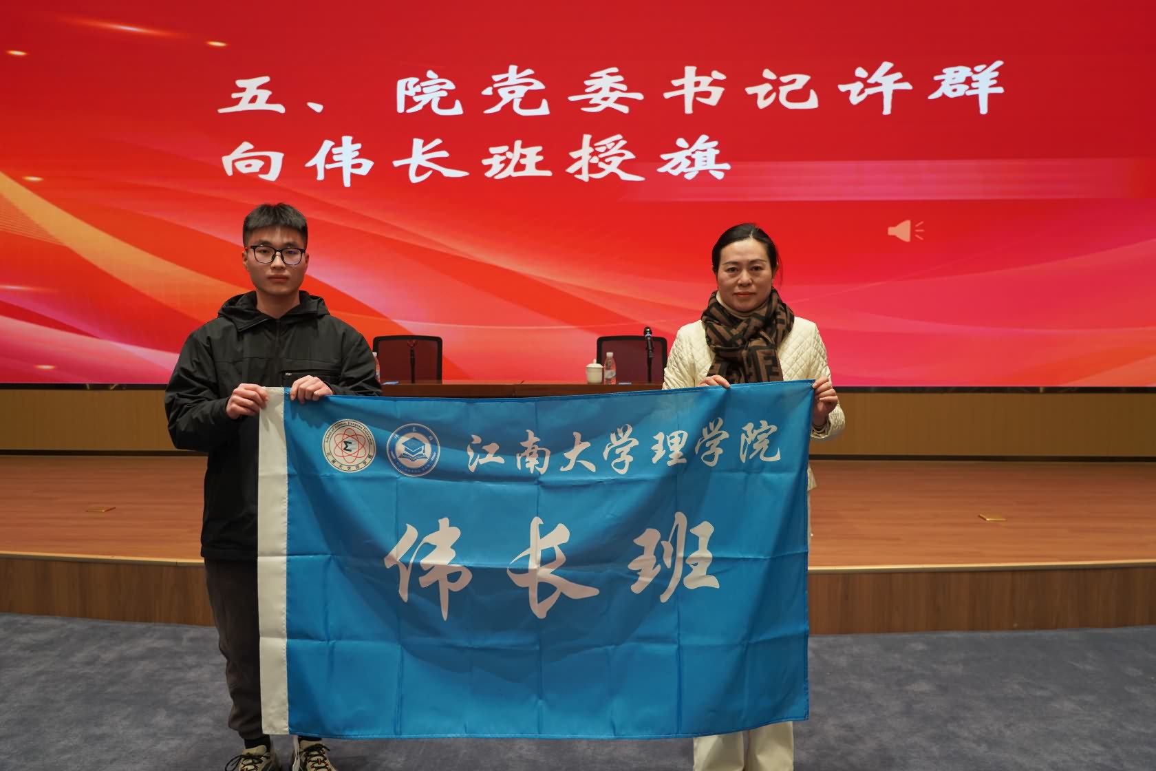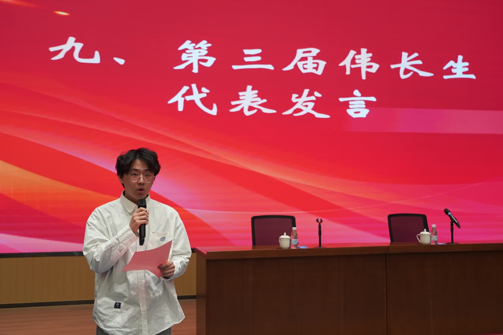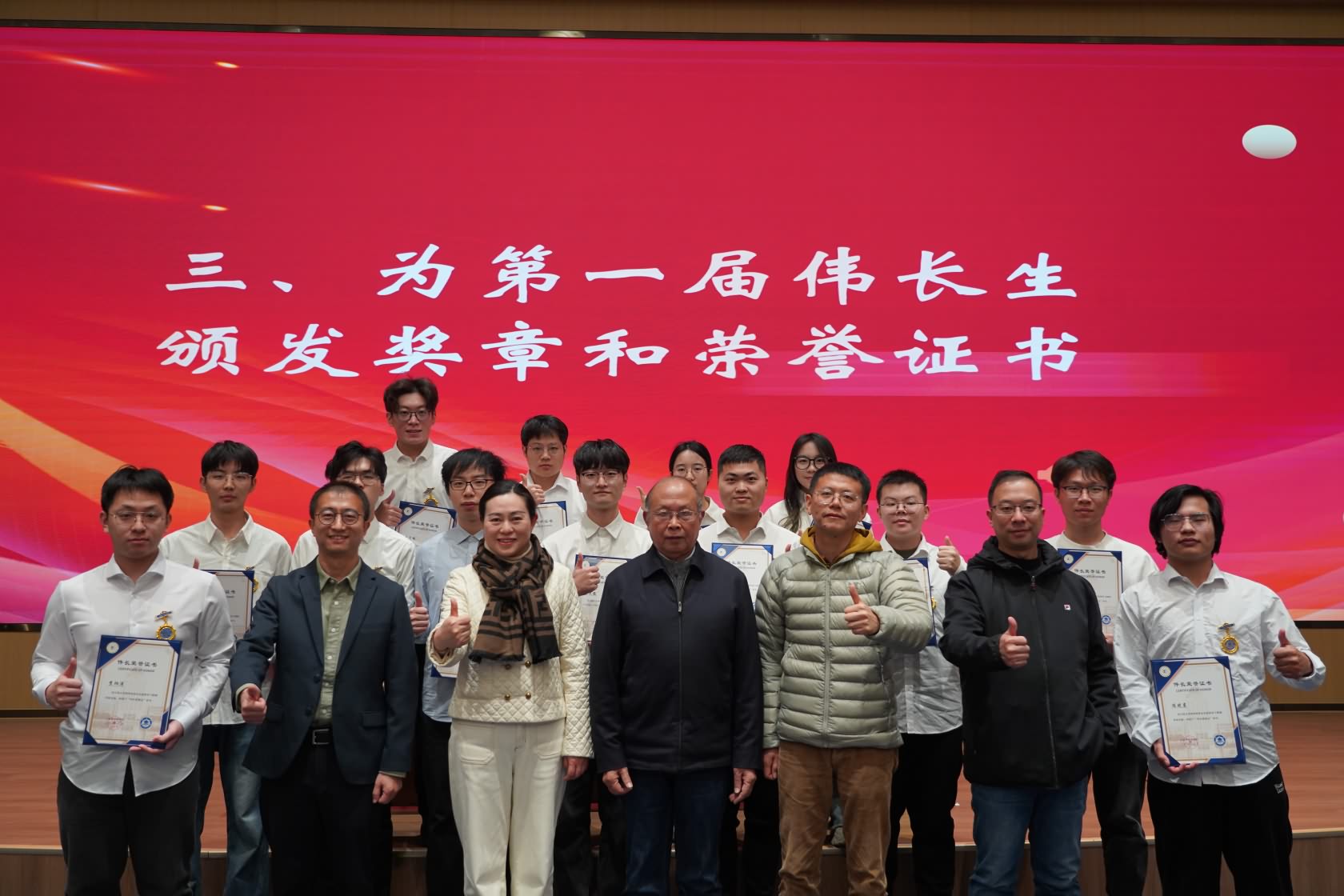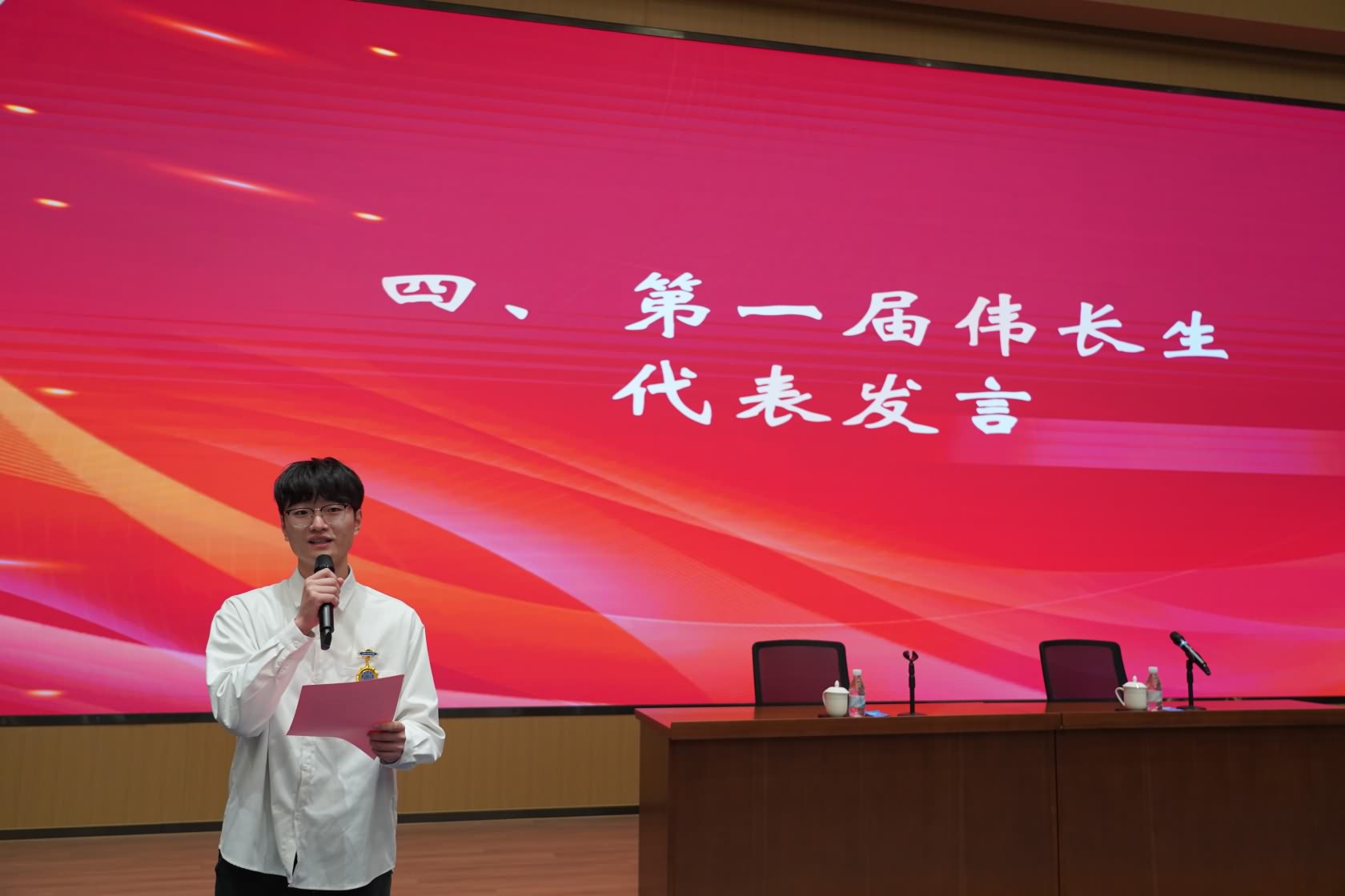 仪式上,陶文沂为第一届伟长生代表一一颁发奖章和荣誉证书,并进行合影留念。李文骏作为第一届伟长生代表发言,回顾了自开班以来的伟长班学习历程,他祝愿新同学们胸怀伟大抱负,立志不断创新,铭记“厚重数理,博学至新”的院训及伟长精神,绽放青春的绚丽之花。