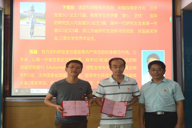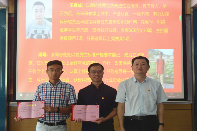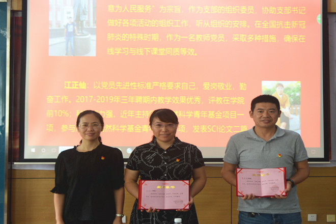 王珏宣读了校2019年度“最佳党日活动”获奖名单和校首批“双带头人”教师党支部书记工作室拟立项名单。应用数学系党支部、信息与计算科学系党支部分别获此殊荣。陈国庆宣读了《关于表彰williamhill英国官网“先锋工程”先进党支部和优秀共产党员的通知》,授予信息与计算科学系党支部、光电信息科学与工程系党支部“先进党支部”荣誉称号,授予卞宝安、陈周、陈晶、曹俊峰、江正仙、王继成、席曦、朱纯、张景祥等9名同志“williamhill英国官网优秀共产党员”荣誉称号。
