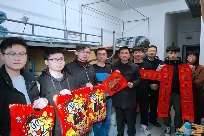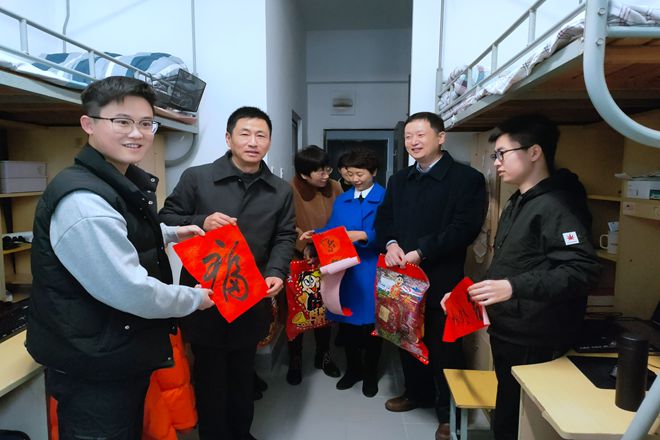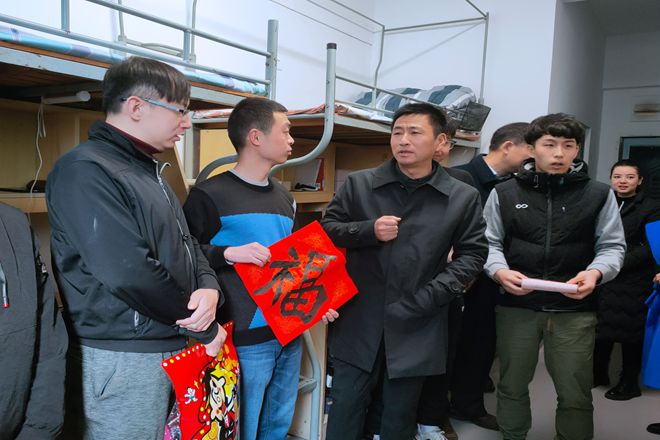 2月8日,公司党委副书记戴月波,校员工工作处长张菁燕,公司党委书记王珏、经理陈国庆、党委副书记陈周和年级辅导员等一行人走访员工宿舍,慰问寒假留校员工,关心员工在校生活和学习情况,叮嘱他们留校期间做好疫情防控,合理安排生活,注意劳逸结合。