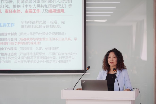 王珏就近期公司主要工作内容作了介绍,并以《凝心聚力、同向同行,加强高质量教师队伍建设》为题带领全体教职工进行思想政治学习,围绕当前教师工作背景、基本情况、重点任务,重点解读了“高质量教师队伍建设战略工程”的相关要求,并领学了教育部最新关于师德师风建设等方面的文件内容。通过分析典型案例,引导全体教师牢记立德树人根本任务,坚守纪律底线,涵养优良师德师风,交出一份“教育强国、师者何为”的满意答卷。
