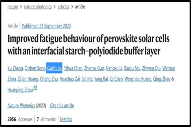 前不久,在9月21日,刘桂林老师合作的另一项相关工作(位次第三)以 “Improved fatigue behaviour of perovskitesolar cells with an interfacialstarch-polyiodide buffer layer”为题发表于顶级学术期刊《Nature Photonics》(IF: 39.7)上。该工作钙钛矿材料本征性蜕化问题,在钙钛矿层的界面处引入多碘化物超分子(淀粉多碘化物)缓冲层。该缓冲层可在抑制钙钛矿中的离子迁移的同时促进卤素空位缺陷的自修复,从而在器件运行期间,持续发挥作用,大大提升了电池的长期稳定性。改性后的钙钛矿太阳能电池表现出更好的耐用性,特别是光/暗循环运行下的疲劳特性得到明显改善,器件在42个昼夜循环(12/12小时光/暗循环)老化后,保持了98%的初始功率。在上述的工作中,刘桂林老师所在的光伏团队,以载流子动力学研究为根基,对钙钛矿太阳电池内瞬态荧光与瞬态光电的各项过程进行了详尽的分析研究。