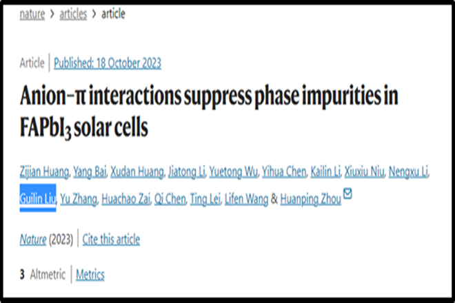 为实现更为可控的钙钛矿薄膜生长,公司青年教师刘桂林与北京大学周欢萍教授团队深度合作,研究成果以“Anion-π interactions suppress phase impurities in FAPbI3 solar cells”为题,于10月18日在线发表于顶级学术期刊《Nature》(IF: 69.5)。在该工作中,研究团队基于阳离子B位配位相互作用的传统思路,提出了全新的方法。基于阴离子-π相互作用,引入缺电子受体与钙钛矿中的阴离子X位结合,精准调控合成反应动力学,获得了更高质量的晶体,有效抑制了纳米与原子尺度缺陷。尤其是阴离子-π相互作用与配位相互作用分别针对两个独立的反应物位点,为钙钛矿薄膜的可控生长提供了全新的调控工具。