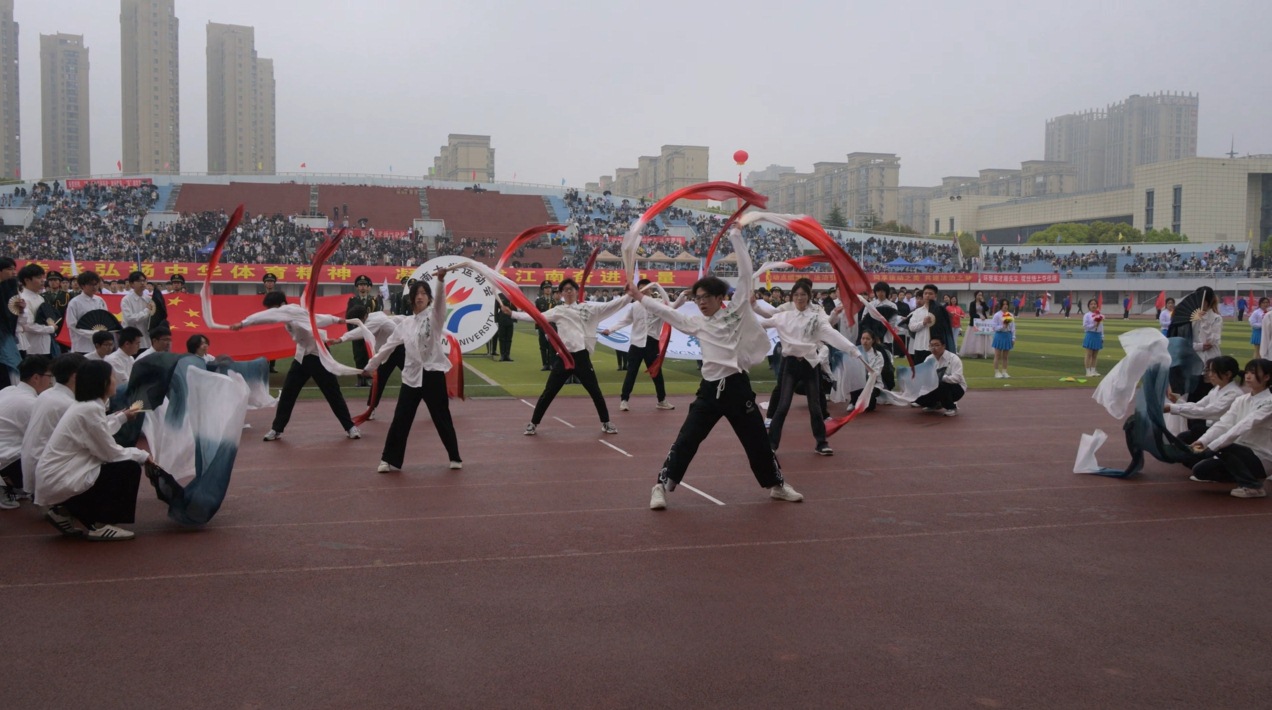 开幕式上,williamhill英国官网的方阵以简洁的水墨黑白为主,辅以绿色的清竹和喜庆的红扇,一股强烈的中国风跃然而出。他们神采奕奕,步伐坚定;他们朝气蓬勃,昂首挺胸;他们“理应有你,再创辉煌”的呼声在场上回荡。伴着气势恢宏的口号,williamhill英国官网方阵迅速散开成四组直角和一颗爱心的模样。随着充满激情的音乐响起,红白扇和黑白扇交相辉映,在空中齐飞的红黑飘带相互交错,构成一幅美丽的画卷,展示了理院人“追求卓越,敢为人先”的精神。