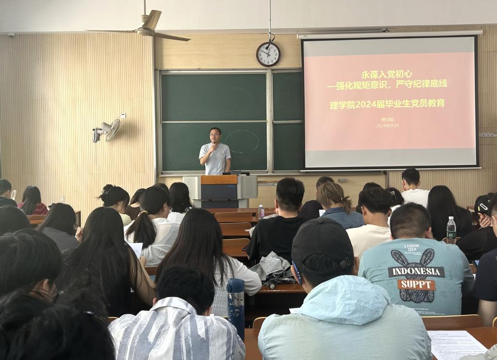 董小平以《永葆入党初心—强化规矩意识 严守纪律底线》为题为毕业生党员上党课,对各位毕业生党员进行了深刻的离校教育。他从四个方面对党员同志们提出了期许:希望党员同志们要坚定理想信念,时刻牢记使命;能永葆匠心精神,追求学业和事业的精益求精;要发挥先进模范作用,率先担当社会责任;强化规矩意识,严守纪律底线。他特别结合当前正在开展的党纪学习教育,希望毕业生党员要知敬畏、存戒惧、明底线,进一步增强了立身做人、恪守底线的自觉性,坚决杜绝违规违纪行为,确保主题教育入脑入心。
