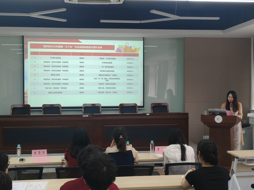 活动在悠扬的团歌声中拉开序幕。九支社会实践团队代表依次上台展示答辩。代表们准备充分,以图文并茂的方式从团队实践项目的背景、内容、预期成果、可行性等一一分析。答辩结束,许金红对暑期社会实践的基本情况作介绍,对团队代表们的表现予以高度肯定,强调了社会实践的重要性和意义,并叮嘱各位实践队员在实践过程中时刻绷紧安全弦,牢记安全第一。