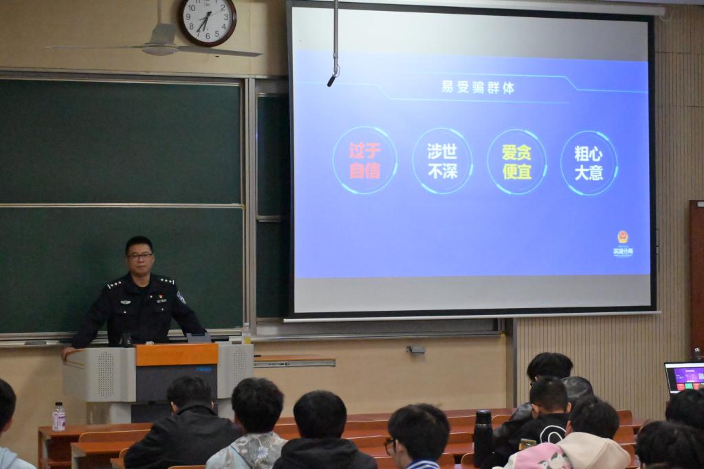 康警官以其丰富的经验与深刻的见解,为员工们揭示了网络诈骗的多重面纱。以近期发生的诈骗案例切入,康警官介绍了网络刷单返利、校园贷诈骗、游戏虚拟交易、冒充电商物流客服诈骗等在老员工群体中多发的诈骗类型及其特征,深入分析了诈骗分子的心理和行为模式,并针对每种常见的诈骗手段给出了有效的应对策略。他强调,诈骗手段不断翻新、层出不穷,但防范诈骗的关键在于提高个人的警觉性和辨别力。康警官还特别总结出易受诈骗群体的四个特质:过于自信,涉世不深,爱贪便宜,粗心大意,督促同学们自查。