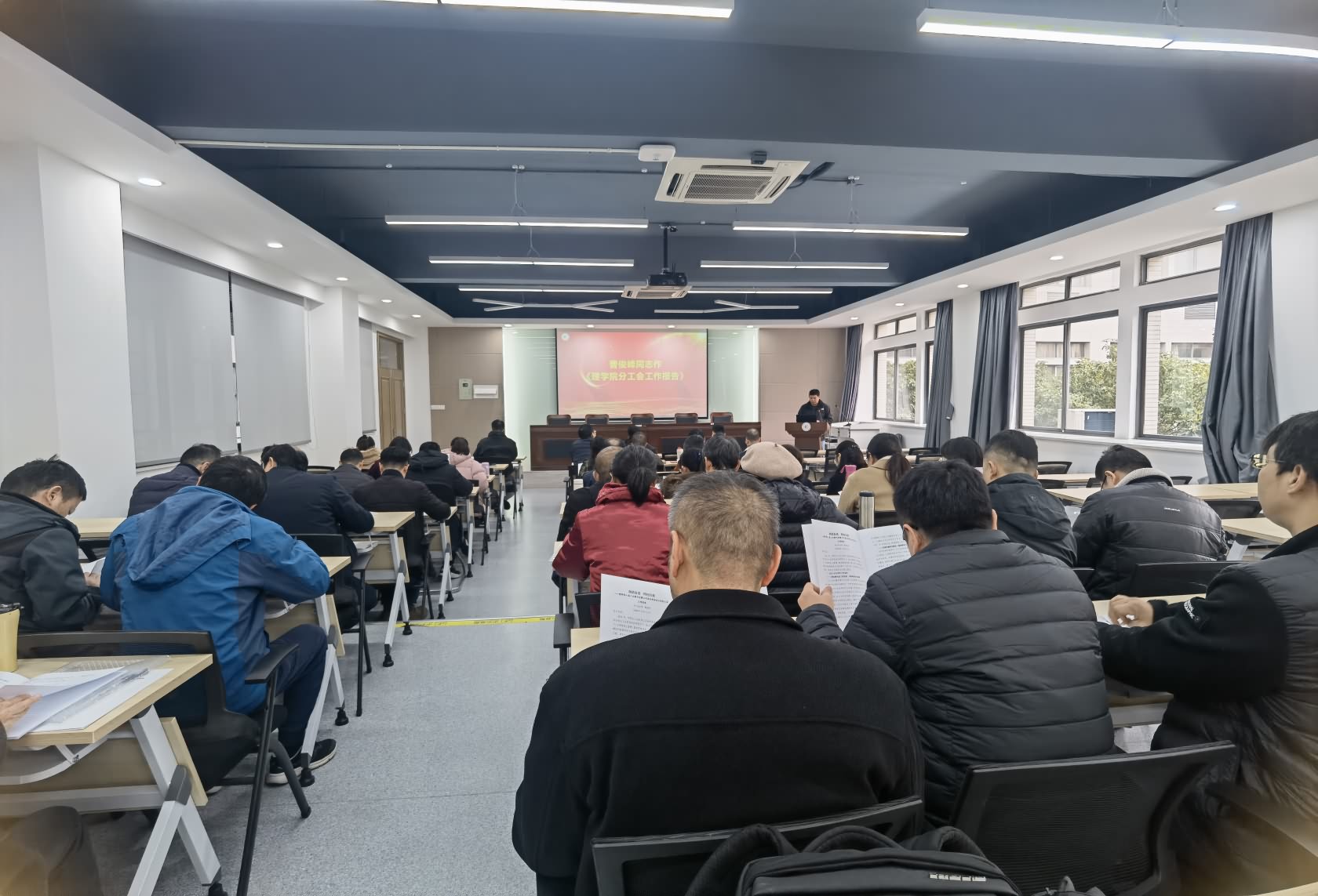 会议在庄严的国歌声中拉开序幕。曹俊峰作了《和谐奋进,理应有我》的工作报告。报告从深化教代会工作机制、强化师德师风、特色活动开展、关注青年教师成长等6个方面回顾了分工会一年来的主要工作和成绩。同时,他还从找准工会工作的结合点和着力点,发挥好工会工作的桥梁和纽带作用,履行好工会工作的职责和使命等三个方面汇报了分工会2025年工作要点,多措并举鼓舞教职工以良好的心态、健康的身体和昂扬的斗志投身公司、公司的事业发展。