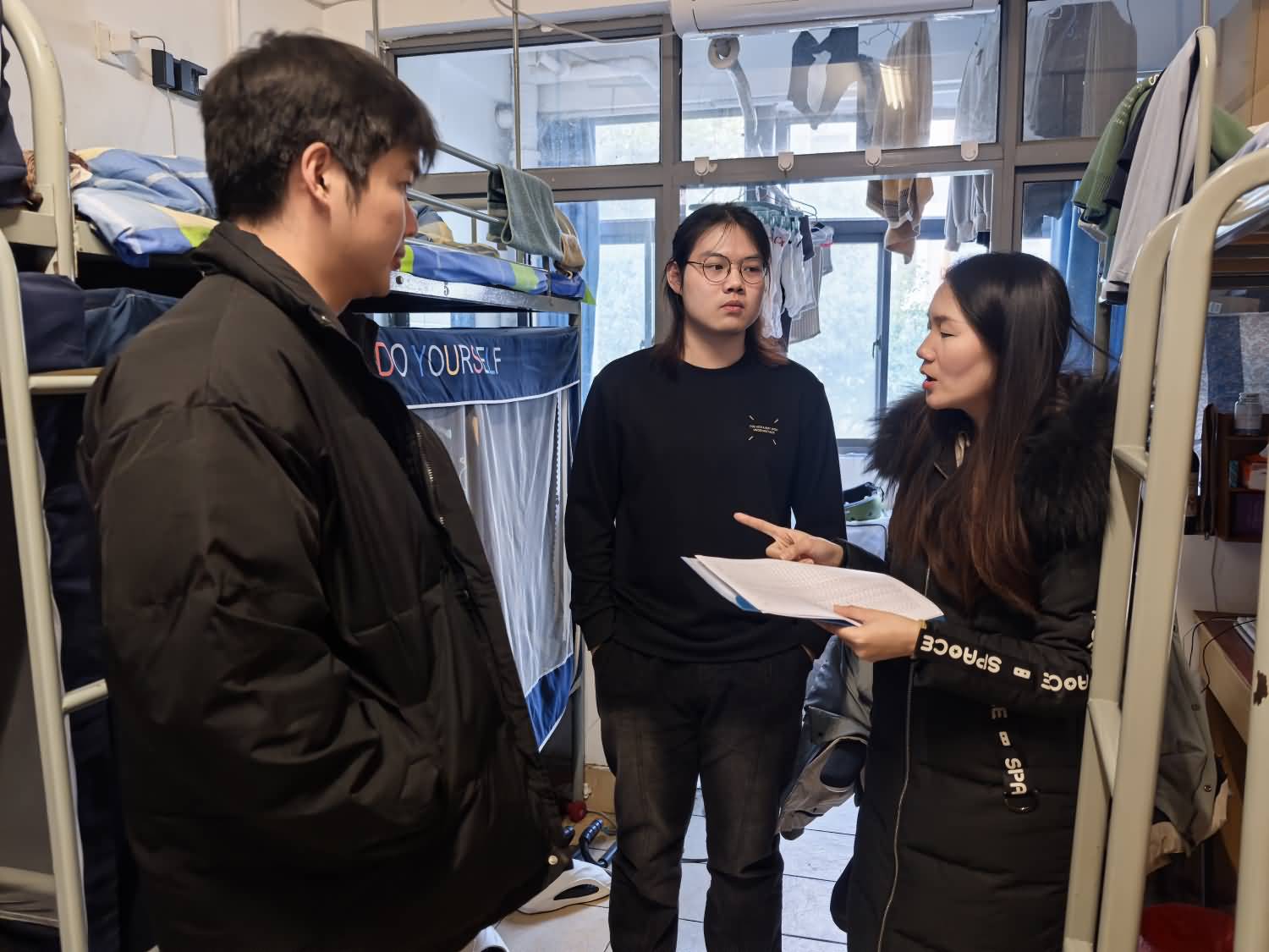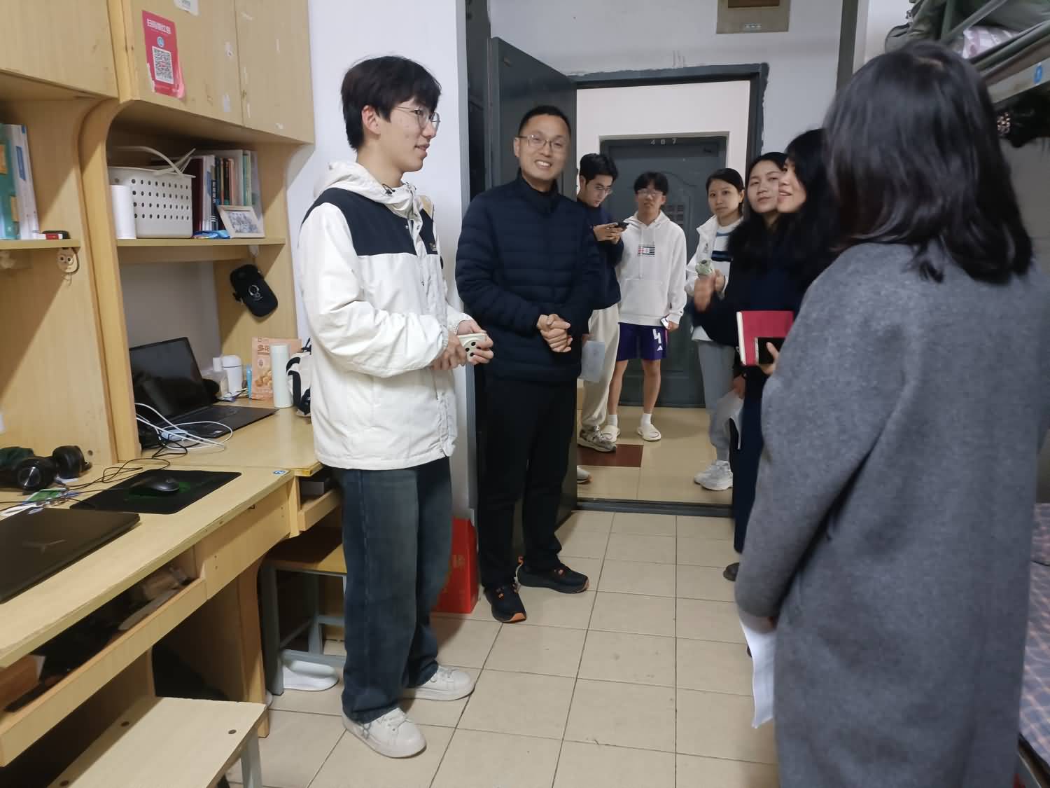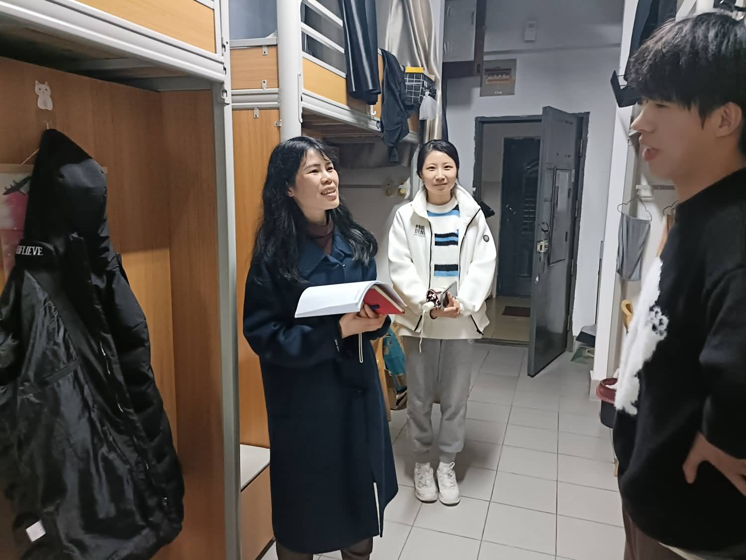 走访第一站,团队前往桃园走访2024级本科生宿舍。辅导员认真仔细的检查宿舍卫生情况,排查有安全隐患的违规电器,细心了解了同学们的生活状况。董小平鼓励同学们新学期树立新目标,立长志,立大志,继续努力争取更大进步,并叮嘱同学们要增强自律意识,高度重视宿舍安全问题,合力营造一个安全、健康、舒适的学习和生活环境,以饱满的热情和昂扬的精神投入老员工活中。