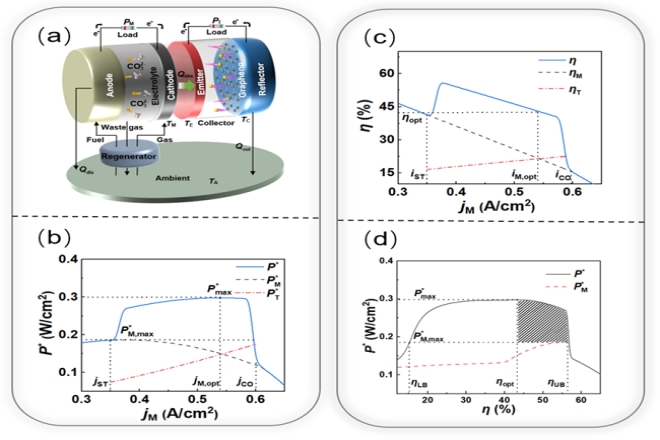 熔融碳酸盐燃料电池(简称MCFC)运行过程中产生大量的余废热,可以被进一步回收用于热电联产发电,从而提高能源的利用率。但是目前已报道的热能回收装置普遍存在低转换效率或功率密度等问题,限制了MCFC的废热回收能力和高效的热电联产。为了应对这一挑战,该工作提出了一种新型的混合发电系统,将MCFC与石墨烯接收极的热离子发电机(简称GCTG)结合起来,其中GCTG可利用MCFC产生的高温废热并产生额外的电力。研究发现,该混合系统的最优输出性能相比于单个MCFC或GCTG有了较大的提升。与其他基于MCFC的混合系统相比,MCFC-GCTG提供了更好的输出性能,从而证实了GCTG相比其他的能量收集装置可以更有效地利用MCFC产生的废热。这项工作为MCFC-GCTG混合系统的优化设计和参数分析提供了关键的理论指导,从而为开发高性能的MCFC热电联产系统铺平了道路。