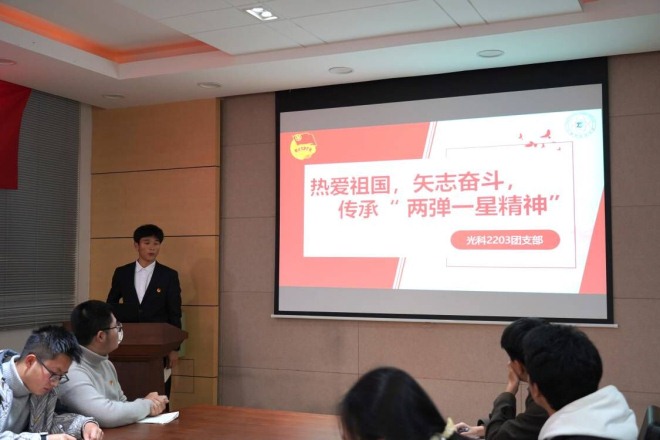 活动在“两弹一星”人物纪录片中拉开帷幕。纪录片从“两弹一星”的历史背景出发,回顾了老一辈科学家舍家报国,隐姓埋名几十年投身“两弹一星”研制的感人故事。光科2203副团支书王博翔从内涵、背景、精神、传承四个方面对“两弹一星”精神进行了领学,鼓励同学们明“科技强国”之鸿志,承“两弹一星”精神,为完成中华民族伟大复兴不懈奋斗。