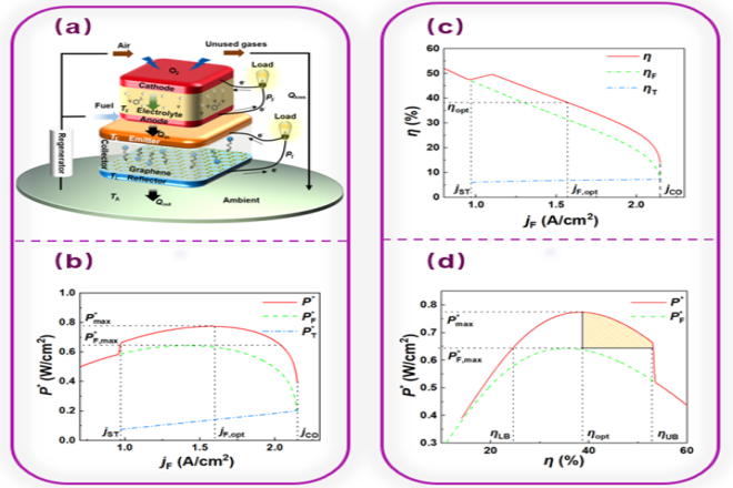 从固体氧化物燃料电池(简称SOFC)中释放的废热包含巨大的能量,可以被进一步回收用于热能级联利用,是目前的热门研究领域。然而,目前已报道的热电能量转换器件由于低转换效率或功率密度等因素限制了SOFC的废热回收能力,无法用于高效的热电联产。为了应对这一挑战,该工作提出了一种新型的混合系统,将SOFC与石墨烯集电极的热离子能量转换器(简称GTEC)结合起来,其中GTEC收集SOFC产生的高品位废热并产生额外的电力。研究发现,该混合系统的最大功率密度在工作温度为1073 K时可以达到0.774 W/cm2,是单独SOFC的1.20倍,这表明混合系统的输出性能有了相当大的提高。与其他基于SOFC的混合系统相比,SOFC-GTEC提供了更好的输出性能,从而证实了GTEC相比其他的能量收集装置可以更有效地利用SOFC产生的废热。这项工作为SOFC-GTEC混合系统的优化设计和参数分析提供了关键的理论指导,从而为开发高性能的SOFC热电联产系统铺平了道路。