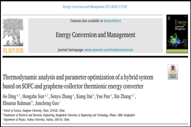 近日,williamhill英国官网光电信息科学与工程系2020级本科生大创团队在高温燃料电池的废热回收利用与热电联产方面取得重要研究进展,研究成果以“Thermodynamic analysis and parameter optimization of a hybrid system based on SOFC and graphene-collector thermionic energy converter”为题发表在热力学与能源利用领域顶级期刊《Energy Conversion and Management》(中科院一区Top期刊,影响因子:11.533)。光科2001本科生丁奥和孙鸿哲为论文的共同第一作者,williamhill英国官网张欣副教授为论文的唯一通讯作者。该项工作的合作者为Bangladesh University of Engineering and Technology的Ehsanur Rahman助理教授以及福州大学郭君诚副教授。该研究工作得到了江苏省自然科学青年基金项目的资助。