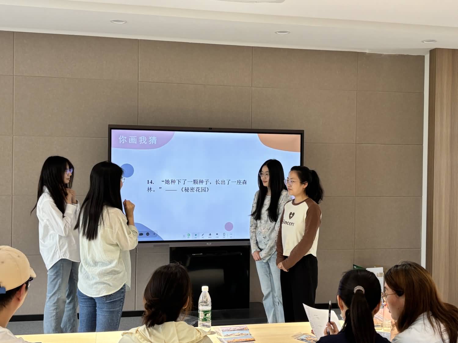 书香接力赛更是将活动推向高潮。四支研究生队伍摩拳擦掌,在“知识+运动”的双关卡中展开激烈角逐。经典问答环节,选手们凝神思考,快速应答与世界名著相关的选择题、判断题、简答题,展现出扎实的文学功底;你划我猜环节,队员们默契配合,用夸张生动的肢体动作演绎“我站在桥上看风景,看风景的人在楼上看我”“我要一步一步往上爬”等经典语句,现场笑声不断。经过紧张比拼,最终语翼飞扬队赢得比赛。活动尾声,全体参与人员合影留念,将这份对阅读的热爱定格成美好的瞬间。