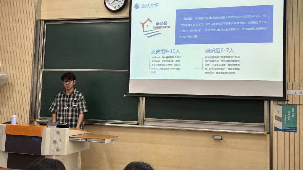 韩首名开启招新宣讲环节。他以生动的语言、详实的案例,从团队的组织架构、特色项目、未来规划等多个维度展开介绍,通过PPT展示了蓝阶梯成立4年来获得的丰硕成果。几位老队员纷纷走上讲台,分享他们在“蓝阶梯”的难忘经历。他们用质朴的语言讲述在乡村实践中的酸甜苦辣,真实而感人的故事,让在场同学感同身受,也激发了大家投身乡村振兴实践的热情。