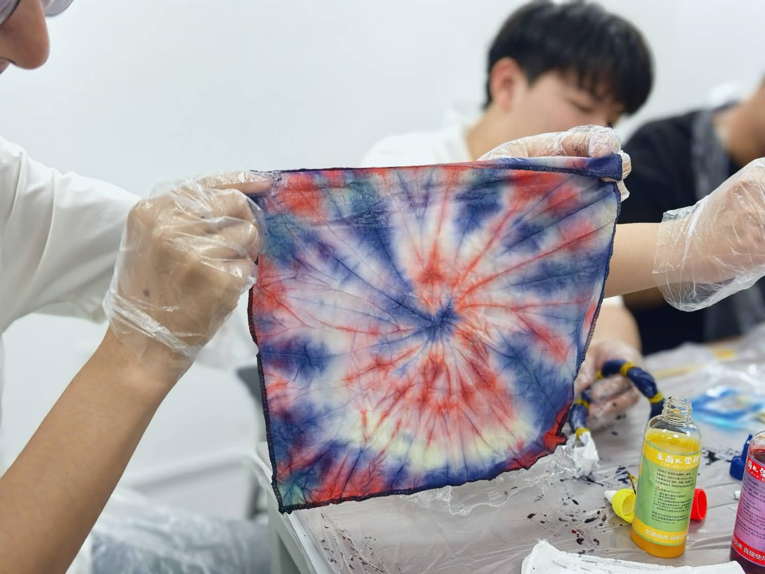 活动尾声,师生齐聚展示亲手制作的扎染作品。班主任在总结中表示:“此次活动不仅培养了同学们的团队协作能力,还增强了班级凝聚力。”活动后全体成员合影留念,同学将作品保留,作为此次体验非遗文化的纪念品。